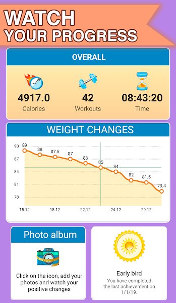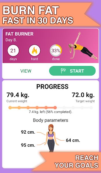 Algunas características y capacidades de la aplicación Burn fat workout in 30 days. HIIT training at home para Android: