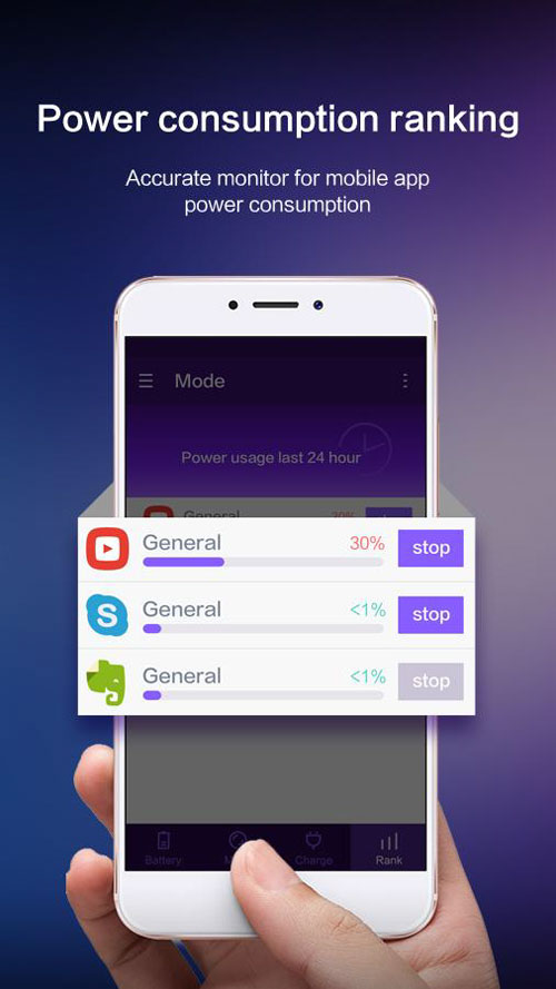 - Clasificación de consumo de energía: listar aplicaciones mostrando el nivel de carga consumido