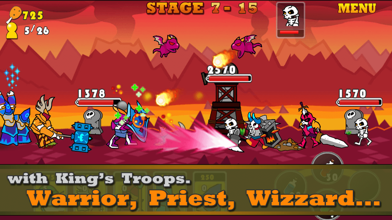 Naked King – 파드샤 브레헤는 Acton Game 게임 스튜디오에서 안드로이드 장치용으로 출시된 전략 장르의 게임입니다. 이 게임은 사실상 Acton Game 게임 스튜디오의 첫 번째 안드로이드 마켓 게임이며, 제작자들은 첫 번째 출시에서 간단한 게임 플레이와 즐거운 경험을 제공하는 데 성공했습니다. Naked King는 타워 디펜스 게임 스타일입니다. 이 장르의 모든 게임은 주요 목표인 타워 방어를 따릅니다! 이 게임에서도 마찬가지로 주요 목표는 타워를 방어하는 것이며, 다른 작업을 수행할 필요가 없습니다. 게임의 스토리 라인은 당신을 흥미 진진한 모험으로 이끕니다. 예로부터 인간들은 몬스터들과 평화롭고 어떤 문제도 없이 살았고 시간이 흘렀습니다. 그러나 어느 밤 몬스터 왕의 탐욕과 욕심으로 인해 그들은 인간들의 영토로 가서 인간 왕의 옷과 왕관을 훔치게 됩니다. 다음 날 깨어난 인간 왕은 자신에게 옷과 왕관이 없다는 것을 보고 수치스러워합니다. 그는 이 일을 해결할 수 있는 사람은 몬스터 왕뿐이라는 것을 깨닫고 몬스터 영토로의 공격 명령을 내립니다. 이제 당신은 전투의 한 쪽으로서 자신의 영토를 지키고 상대를 무찌르려고 노력해야 합니다. 어느 영토를 보호할지 선택하든, 작업 시작 시 방어 타워와 일부 노동자가 제공됩니다. 분명히 노동자들은 타워 자원을 구하기 위해 소를 태우기만 합니다. 노동자들이 더 많은 소를 타워로 가져오면 더 많은 병사를 생성하고 결과적으로 자신의 타워를 더 잘 지킬 수 있으며 적의 타워에 더 많고 파괴적인 공격을 가할 수 있습니다. 어느 쪽이든 상대의 타워를 더 빨리 파괴할 수 있는 쪽이 승리합니다.