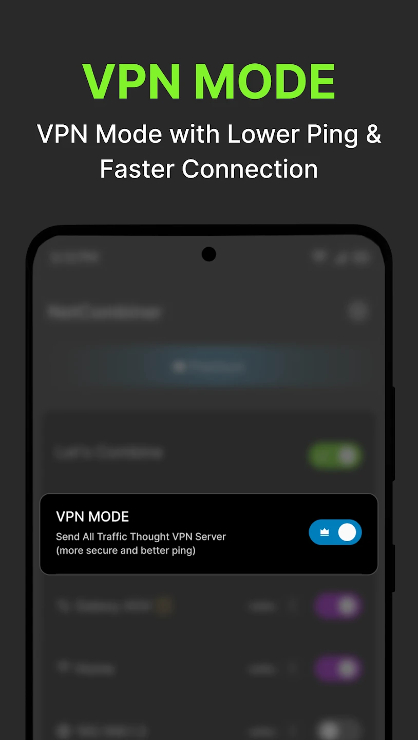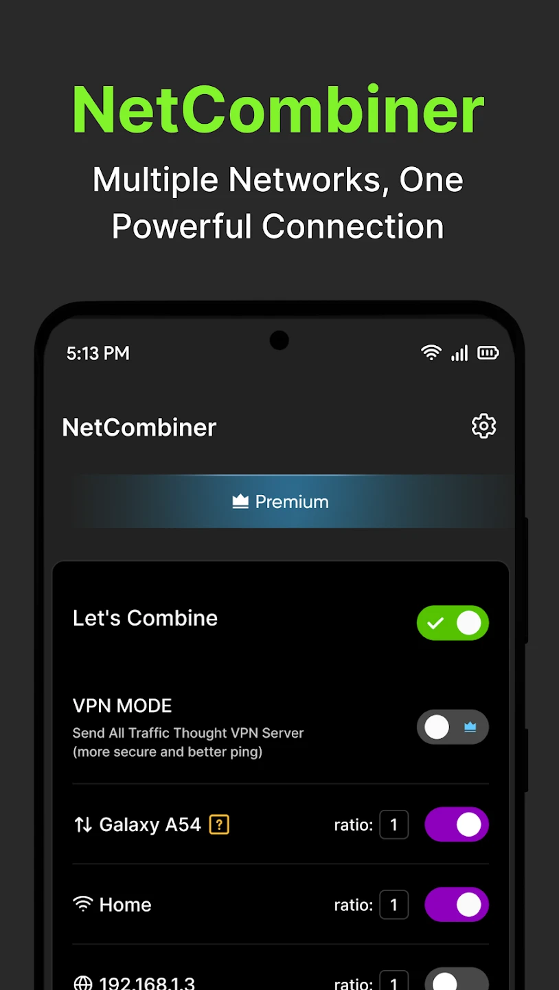 - Combines multiple internet connections: Wi-Fi, LAN, USB Tethering, etc.