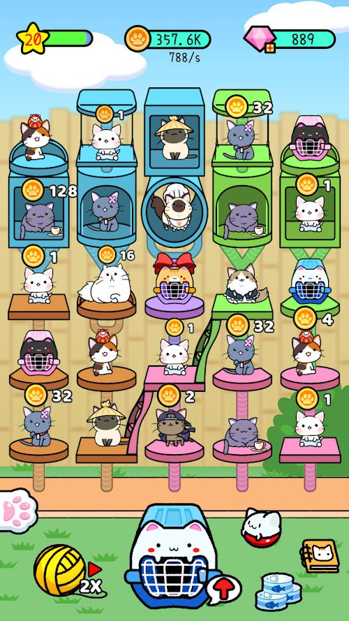 Cat Condo 2 — Галерея кошек 2 — это захватывающая и любимая игра в жанре пазлов, выпущенная тайваньской игровой студией Zepni Ltd для устройств на операционной системе Android. Если вы любите милых и очаровательных кошек, не упустите возможность и установите эту игру на свое устройство Android прямо сейчас! История Cat Condo 2 такова: игрокам нужно объединять кошек между собой, создавать новых кошек и покупать больше кошек с помощью денег, полученных от новых кошек, чтобы заполнить свою собственную галерею кошек различных пород. Каждые 10 секунд на экране вашего устройства появляется карьер кошки. Когда вы нажимаете на карьер и открываете его, появляется маленькая белая милая и очаровательная мультяшная кошка. Когда вы снова открываете следующий карьер и у вас есть две кошки, вы можете убить одну из них и отпустить другую, чтобы их породы соединились и появилась новая кошка. Теперь вы можете объединять эти новые кошки друг с другом и создавать еще одну новую кошку, и, как вы, возможно, уже догадались, вы можете продолжать этот процесс и объединять кошек одну за другой и создавать новые породы. Сочетание маленьких кошек друг с другом создает кошку Sneaky Cat, сочетание кошек Sneaky Cat создает кошку японской бобтейл, сочетание кошек японской бобтейл создает кошку сомалийской породы и так далее, сочетая кошек друг с другом, создавая новые породы. Почти вся игровая механика выглядит так, и вам просто нужно нажать на экран вашего устройства, чтобы кошки появились и вы могли их объединять. Поскольку ожидание появления новой кошки не является увлекательным, игроки могут нажимать на экран последовательно и увеличивать скорость появления новых кошек.