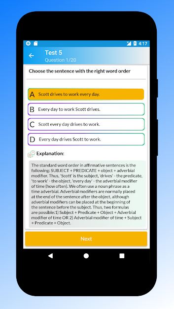 - Имеет 60 тестов и 1200 упражнений по грамматике английского языка