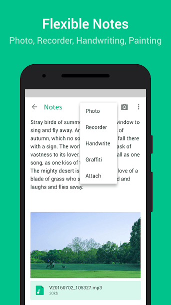 - Возможность создания заметок с фотографиями, аудиозаписями и рукописными заметками