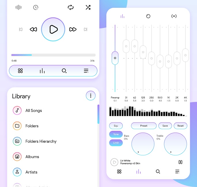 Liv White – Poweramp v3 Skin — это набор скинов с десятками уникальных цветовых решений и потрясающим дизайном для музыкального проигрывателя Poweramp, разработанный студией giannisgx89. Он был выпущен на Google Play по цене 1,49 доллара, но теперь доступен бесплатно. Мы проводим много времени со своим мобильным телефоном, поэтому очень важно, чтобы его интерфейс выглядел максимально красиво. Иногда необходимо изменить тему и интерфейс приложений, чтобы избежать однообразия и усталости. Многие люди слушают музыку в течение длительного времени, поэтому их музыкальному проигрывателю нужно немного разнообразия и изменений. Давайте рассмотрим Liv White – Poweramp v3 Skin, который является одним из приложений для изменения темы музыкального проигрывателя Poweramp. Как вы знаете, Poweramp является одним из самых популярных и мощных мобильных приложений для воспроизведения музыки на операционной системе Android. Благодаря постоянным обновлениям, улучшению качества звука и исправлениям пользовательского интерфейса, это приложение заняло особое место среди пользователей. Можно сказать, что наиболее важной особенностью являются продвинутые звуковые настройки, позволяющие пользователю вносить значительные изменения в звуковой выход. Конечно, это не конец и у него есть и другие функции. Из-за его популярности мы хотим представить новое приложение под названием Liv White. В действительности, Liv White — это тема для музыкального проигрывателя Poweramp, которая позволяет пользователю использовать различные скины для своего музыкального проигрывателя Poweramp. Это не только ограничивается темой, но также предоставляет пользователю больше функций. Например, можно выбрать привлекательные и настраиваемые иконки и выбрать любые из них в соответствии с вашими предпочтениями. Кроме того, векторная графика обеспечивает высокое качество иконок и темы. В целом, если вы ищете возможность редактирования и настройки приложения Poweramp, то Liv White — это подходящий выбор, который предлагает вам множество вариантов.