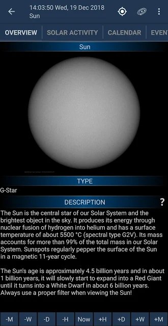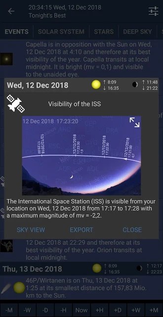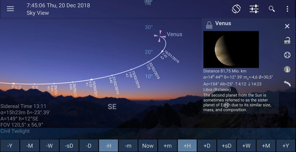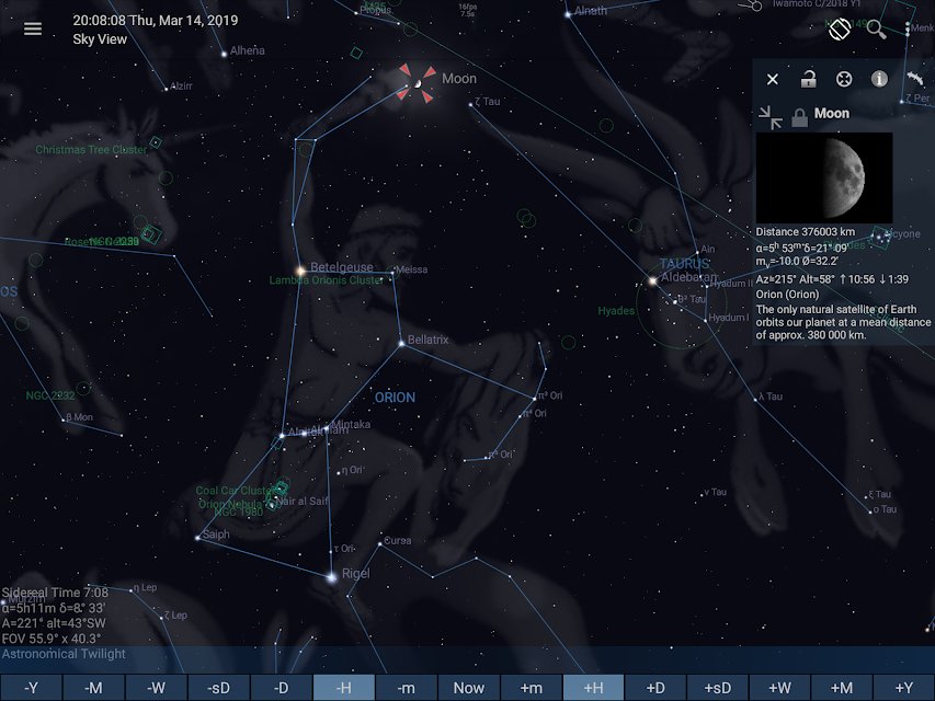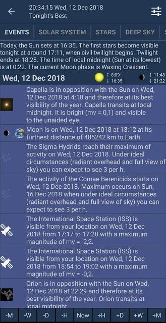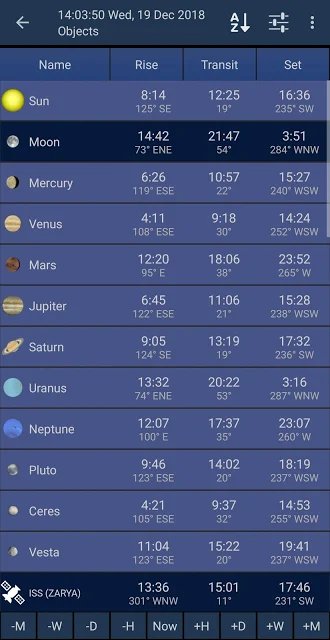 - Небесная карта с возможностью масштабирования звезд, планет, астероидов и т. д. (выше и ниже горизонта)