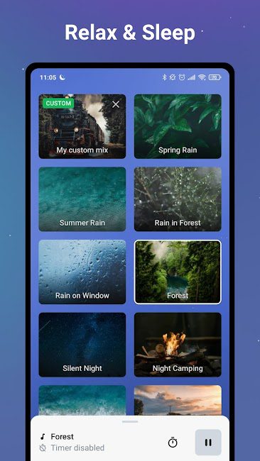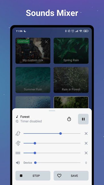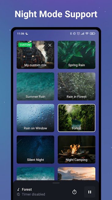 - Функция таймера, чтобы помочь вам заснуть, не беспокоясь о выключении приложения.