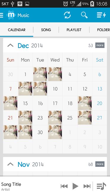 • Встроенный календарь, который отображает песни в зависимости от дня и месяца их загрузки, и вы можете воспроизводить песни, относящиеся к определенному дню.
