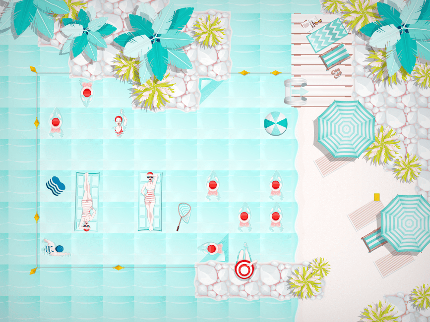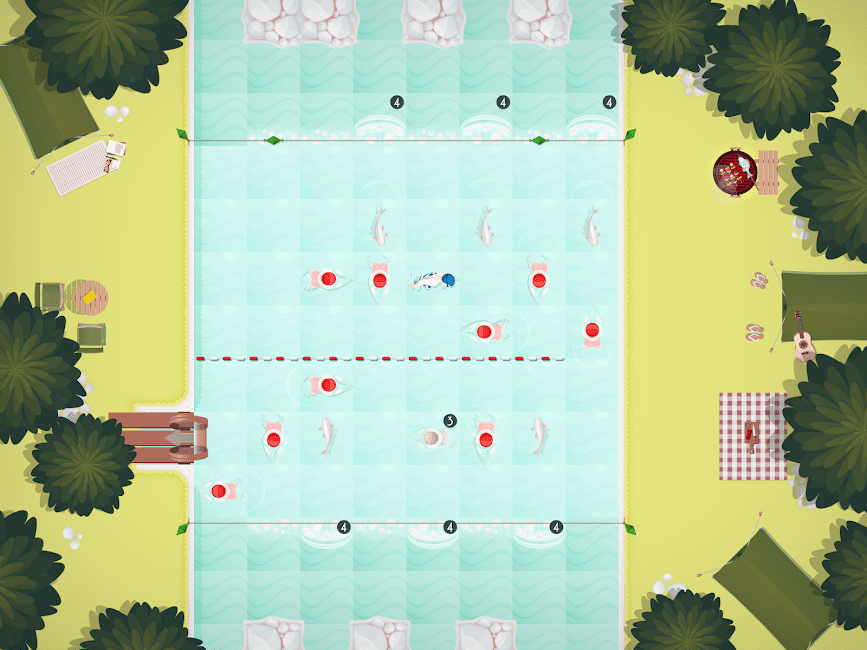 Swim Out — Шноровка — новая, отличная и уникальная игра в жанре стратегических пазлов от студии Lozange Lab для устройств Android, которая только что была выпущена в крупном магазине Google Play по цене 3,5 доллара, и как всегда мы решили представить ее впервые в Иране для наших любителей особенных игр и вновь порадовать вас! Если вы любите пазлы, то обязательно попробуйте Swim Out и установите ее на свое устройство Android; добро пожаловать в спокойное и свежее пространство Swim Out; это пазловая стратегическая игра, которая перенесет вас в солнечный день с бассейном, рекой или морем! В игре Swim Out управление основным персонажем — пловцом — находится в ваших руках; другие пловцы также плавают, но в нашей игре плавание происходит по очереди, и каждый может продвигаться на одну клетку вперед; вам нужно двигаться так, чтобы не сталкиваться с другими пловцами и найти выход через указанные лестницы! Другие пловцы против вас и хотят, чтобы вы не смогли выйти из бассейна; вам нужно умело обмануть их своими высокими интеллектуальными способностями и пройти сотни различных уровней один за другим!