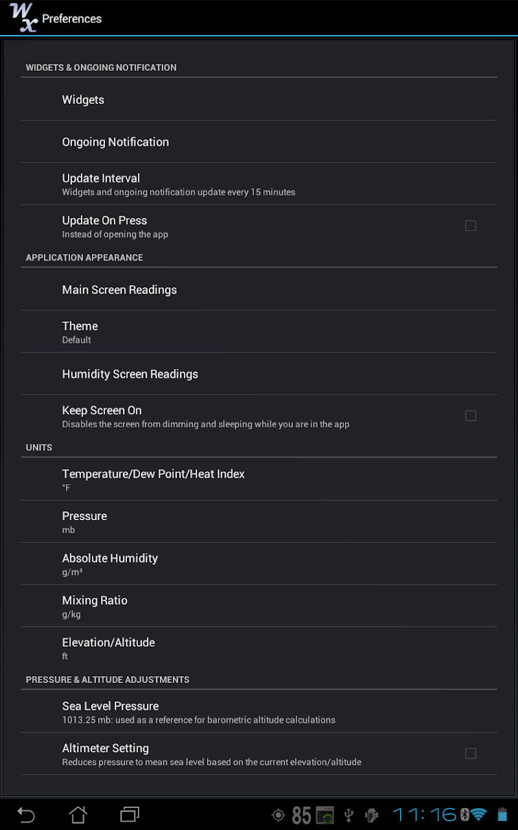 - Возможность выбора единиц измерения температуры (°F, °C, K), давления (мб, дюйм ртутного столба, кПа, атм, Торр, фунт на квадратный дюйм, гПа, мм ртутного столба), влажности (г/м³, кг/м³)