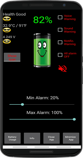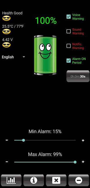Ứng dụng này được thiết kế để giúp bạn quản lý thời gian sử dụng pin và kéo dài tuổi thọ của thiết bị bằng cách thông báo cho bạn về mức pin và các cài đặt có thể giúp bạn tối ưu hóa hiệu suất của điện thoại. Ứng dụng thân thiện với người dùng và bao gồm nhiều tính năng khác nhau để giúp bạn duy trì sức khỏe của pin thiết bị. Bạn cũng có thể tùy chỉnh thông báo dựa trên sở thích của mình và nhận cảnh báo khi pin của bạn yếu. Ứng dụng cung cấp một cách đơn giản và hiệu quả để theo dõi và quản lý việc sử dụng pin của bạn. Battery Alarm PRO cung cấp nhiều tùy chọn để giúp bạn giữ cho thiết bị hoạt động mượt mà và hiệu quả.