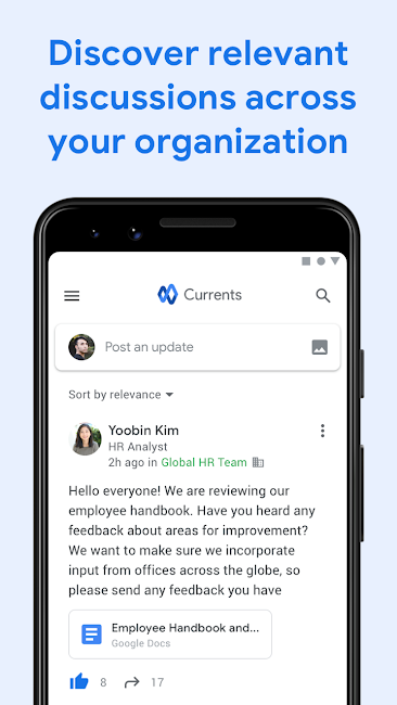 Các tổ chức và cơ quan là những nơi đầu tiên bị ảnh hưởng bởi máy tính và đã sử dụng các tiện ích tuyệt vời của các thiết bị này để nâng cao hiệu suất và tốc độ công việc. Do lịch sử lâu đời của các tổ chức và cơ quan trong việc sử dụng máy tính, luôn có sự cung cấp công nghệ và công nghệ mới nhất cho nhóm người dùng này. Tuy nhiên, thực tế đã thay đổi trong vài năm gần đây và trong một số trường hợp, các tổ chức không thể bắt kịp với sự phát triển công nghệ của các phần khác. Ví dụ, có nhiều phần mềm tốt trong các tổ chức giúp làm việc trở nên dễ dàng hơn, nhưng không có phương pháp thích hợp để nhân viên giao tiếp với nhau và quản lý giao tiếp với nhân viên, thường phải sử dụng ứng dụng và phần mềm tin nhắn không cung cấp hiệu suất tốt. Google nhận ra vấn đề này và phát triển một phần mềm đặc biệt cho công việc này và cung cấp cùng gói G Suite, hiện nay chúng tôi có phiên bản Android của nó để phục vụ bạn. Currents là một ứng dụng để giao tiếp trong tổ chức, dành riêng cho hệ điều hành Android, được phát triển bởi Google LLC và miễn phí trên Google Play. Ứng dụng Android này được thiết kế tốt nhất để tạo ra sự giao tiếp dễ dàng và thoải mái giữa tất cả mọi người trong tổ chức. Quản lý của các tổ chức và công ty có thể chuyển tiếp tin nhắn của mình nhanh hơn và dễ dàng hơn cho nhân viên. Nhân viên cũng có thể dễ dàng giao tiếp với nhau và tham gia vào cuộc trò chuyện. Ngoài ra, còn có khả năng gửi và nhận tệp với tốc độ cao. Ứng dụng này giúp bạn dễ dàng chia sẻ ý tưởng và suy nghĩ của mình với người khác và xác định những người có quan điểm chung và đưa ra nhận xét tích cực về công việc của bạn để bạn có thể làm việc hiệu quả hơn với họ. Ứng dụng này cũng được trang bị công cụ tìm kiếm thông minh của Google để bạn có thể dễ dàng tìm thấy các chủ đề và cuộc trò chuyện quan trọng của mình. Ngoài ra, bạn cũng có thể tìm thấy các chủ đề quan trọng nhất bằng cách sử dụng các thẻ.