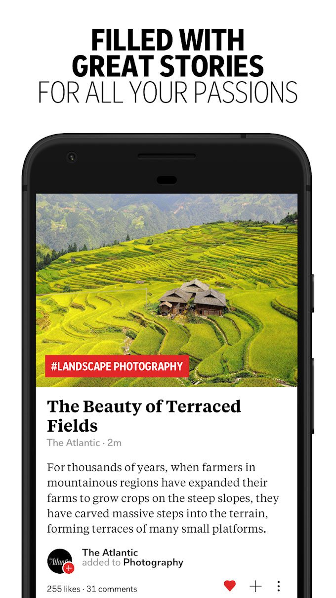 Ứng dụng Flipboard – Tin tức mới nhất, câu chuyện hàng đầu và lối sống đã được tải về hơn 500 triệu lượt và đứng đầu các ứng dụng tin tức hàng đầu, có điểm 4.2 trên 5.0. Hôm nay, chúng tôi đã đặt phiên bản mới nhất của nó trên Apkopia và bạn có thể tải về chỉ với một cú nhấp chuột! Tất cả các tính năng của ứng dụng đều miễn phí và không cần bị crack hay hack.