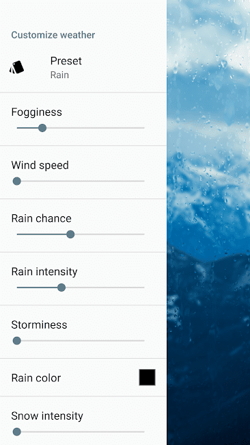 - Tùy chỉnh màu sắc mưa, cường độ mưa và kích thước giọt mưa